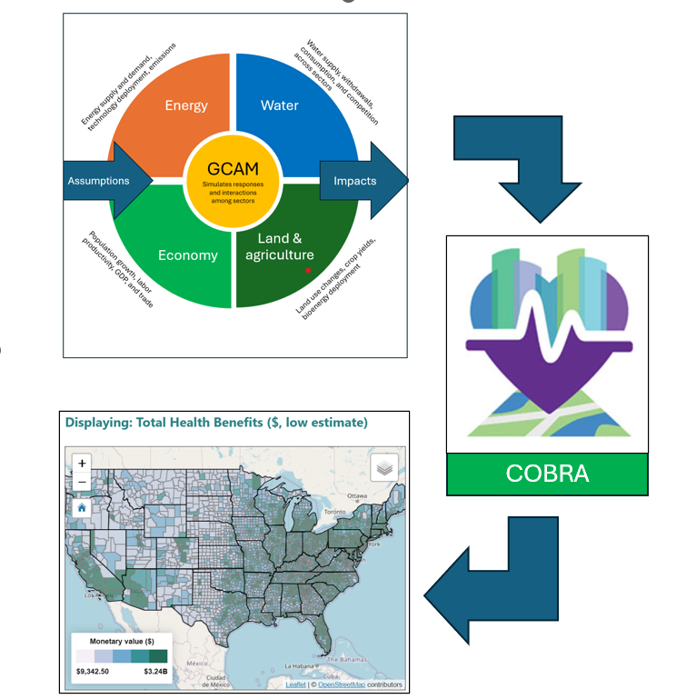 GCAM results can be translated into the inputs for other modeling tools. For example, a GCAM-to-COBRA crosswalk can be used with EPA’s CO-Benefits Risk Assessment (COBRA) tool to estimate the air quality and health impacts of energy futures in the United States. GCAM has also been linked with full-scale air quality models such as the Community Multiscale Air Quality (CMAQ) model, as well as used to develop the internally-consistent scenarios for other uses, including life cycle analysis and assessment of the impacts of autonomous vehicles.